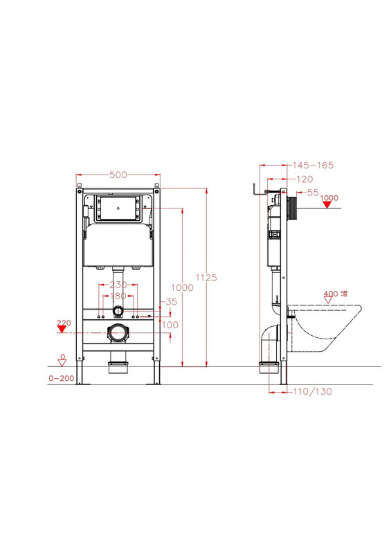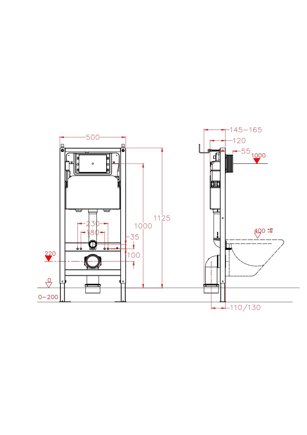 Высота регулируется в диапазоне 1000-1125мм. Инсталляция представляет собой усиленную металлическую раму, которая принимает на себя весь вес сантехнического изделия, а также является надежным упором для унитаза. Благодаря своей продуманной конструкции, вы экономите много пространства за счет спрятанного в раме инсталляции бака для воды, всех креплений и коммуникаций. Полная звуко и шумоизоляция, два режима смыва на 3/6 литров для экономии воды, возможность регулирования мощности потока смыва. Кнопка приобретается отдельно. В механической инсталляции слив осуществляется при помощи рабочих стержней на кнопке смыва и сливного клапана. Подходит для любых подвесных унитазов.