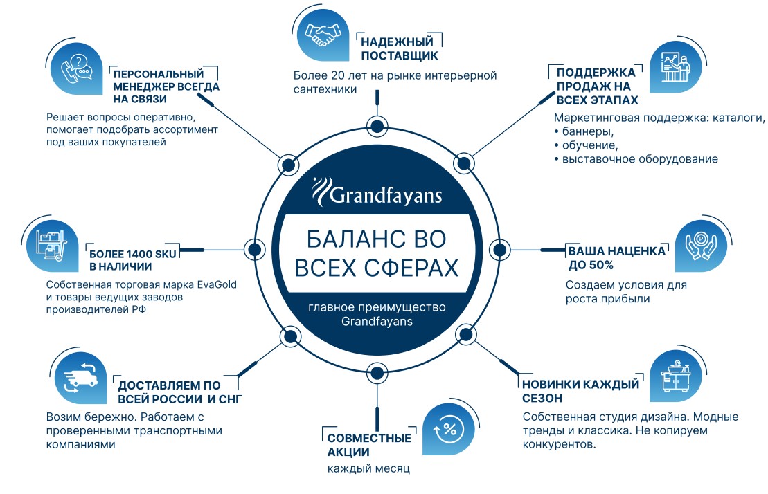 «Грандфаянс» — оптовые поставки санфаянса, бытовой сантехники, мебели для ванной и кухни, душевых кабин